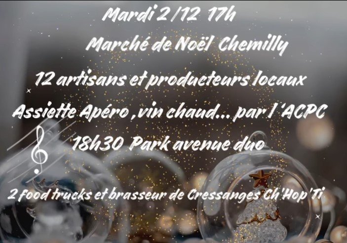 La municipalité de Chemilly organise son 2ème marché de Noël mardi 2 décembre à partir de 17 h :