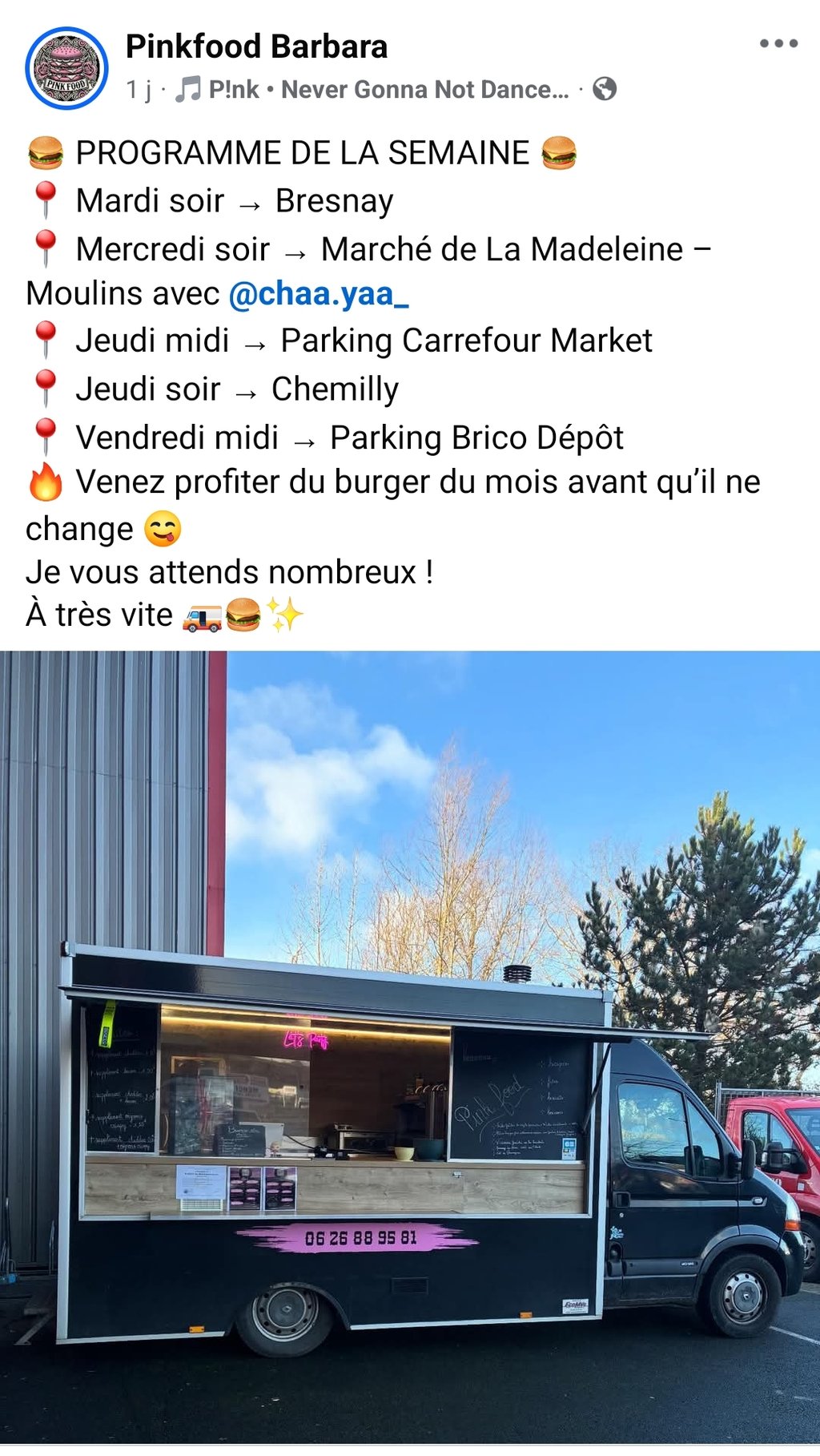 Le food truck "PINK FOOD" est présent à Chemilly un jeudi soir sur deux. Vous pouvez passer commande.